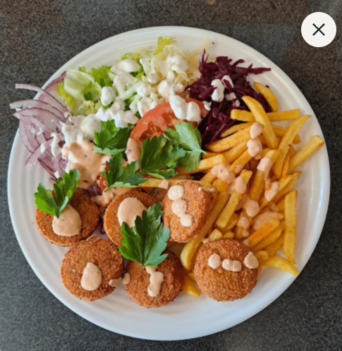 €10.00Pommes, grünem Salat, Gurken, Tomaten, Knoblauchsoße und Sambalsoße