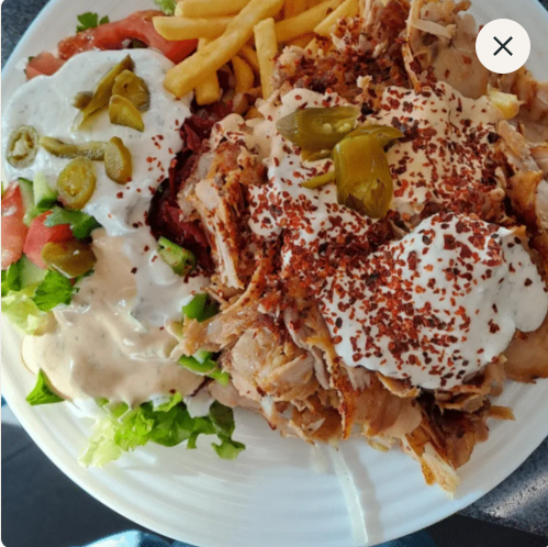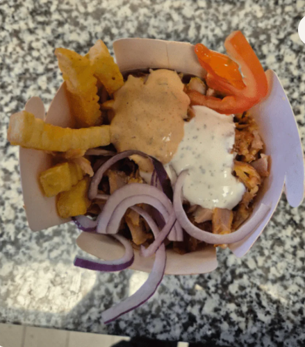 €13.00mit Pommes, Reis, Couscous und Salat, Tomaten, Zwiebeln, Weißkraut, Rotkraut, Joghurtsoße